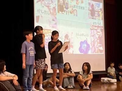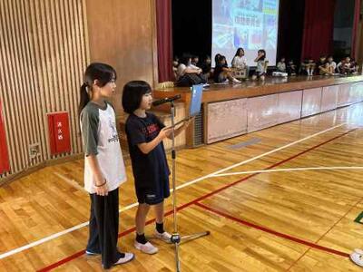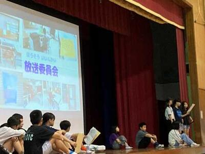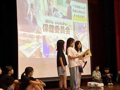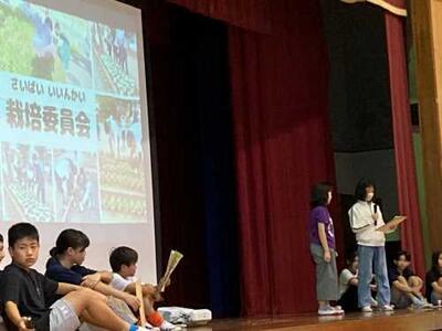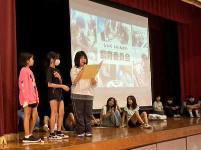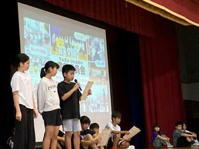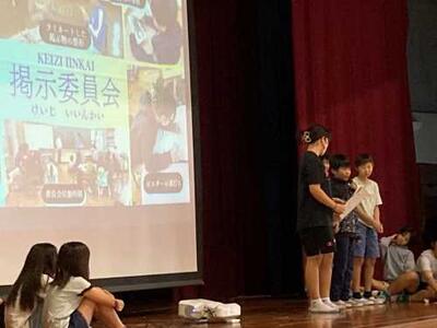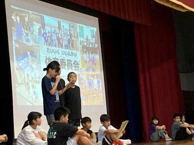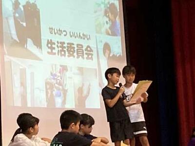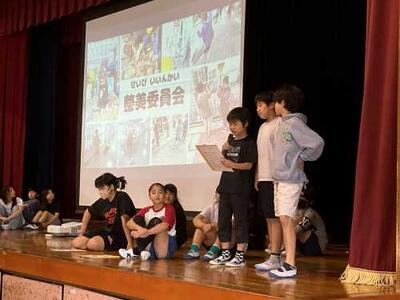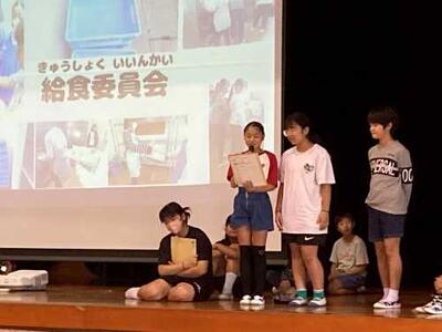 4月23日・24日、全校朝会を開催し、児童会各種委員会の活動紹介が行なわれました。全体の進行活動紹介もすべて児童が行ないました。