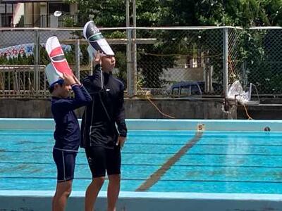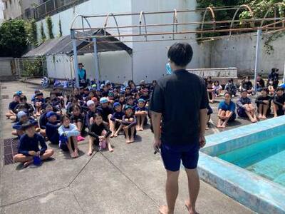暑い日が続きます。いよいよ夏本番が迫ってきました。本日5月21日は、児童にとって待ちに待ったプール授業開始です。そのため6年生を最初の授業として、プールの四隅にお酒・塩・お米を供え、安全祈願を行ないました。