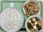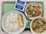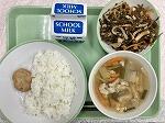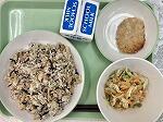 今日の給食の献立は、ひじきごはん、キャベツいりつくね、たくわん和え、牛乳でした。
