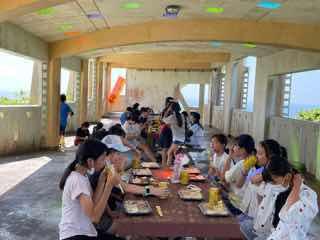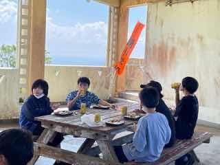 起床は朝の6時です。いつもより早起き?みんな元気です。 朝食もバッチリいただきました。退館式も終えて伊江島へ!