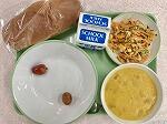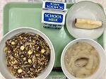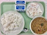 今日の給食の献立は、ほうれん草入りキーマカレー、麦ごはん、ヨーグルト和え、牛乳でした。