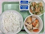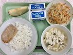 今日の給食の献立は、揚げ出し豆腐、キャベツの塩昆布和え、ふきよせごはん、牛乳でした。