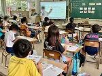 1年1組は図工でカラー版画に取り組んでいて、シール状になったいろいろな色の台紙を切り取り、貼り合わせながら作品を仕上げていました。2組は算数で計算のスキルを高めるためのドリルに取り組んでいて、担任の先生から花丸をもらって嬉しそうでした。