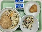 今日の給食の献立は、きつねうどん、焼き栗コロッケ、ひじきサラダ、牛乳でした。