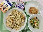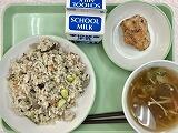 今日のちむどんどん給食の献立は、もずくの酢の物、うむくじ天ぷら、チキナーチャーハン、牛乳でした。