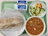 今日の給食の献立は、白花豆のシチュー、にんじんとクレソンのサラダ、ブドウ2個、黒糖パン、牛乳でした。