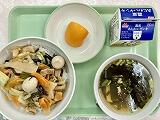 今日の給食の献立は、もずく丼、イナムドゥチ、りんご、牛乳でした。