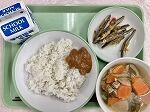 今日の給食の献立は、キビナゴ南蛮漬け、かしわ汁、麦ごはん、油みそ、牛乳でした。