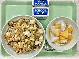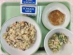 今日の給食の献立は、キノコ入り炊き込みご飯、鶏肉の梅やき、春雨スープ、牛乳でした。