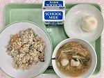 今日の給食の献立は、つくねスープ、ひとくち桃まん、五目おこわ、牛乳でした。
