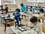 4年1組は理科で「空気中にある水」について、これまで学習してきたことをまとめていました。2組ははがきサイズの版画版を使って雪だるまの絵柄を彫り、インクで刷って作品を仕上げていました。