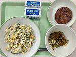 今日のちむどんどん給食の献立は、パクチョイのゴマ和え、手作りうじら豆腐、アーサ汁、ごはん、牛乳でした。
