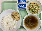 今日の給食の献立は、韓国風焼き肉、わかめスープ、ごはん、牛乳でした。