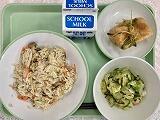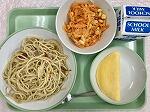 今日の給食の献立は、スパゲティージェノベーゼ、オムレツ、人参とツナのサラダ、牛乳でした。