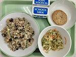 今日の給食の献立は、紅芋の日にちなんだ紅芋入り炊き込みごはん、レンコン入りひらつくね、キャベツのしそサラダ、牛乳でした。