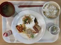 今週は栄養士さんの計らいで「ちむどんどん給食」週間になっています。NHKの朝ドラ「ちむどんどん」に出てきたメニューを提供する取り組みです。今日のメニューは、豚肉のシークァーサー味噌焼き、パパイヤイリチー、ゆし豆腐、ごはん、りんご、牛乳でした。