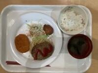 今日の給食の献立は、切り干し大根と小松菜のごま和え、豆腐ハンバーグ、さつまいもの炊き込みごはん、牛乳でした。