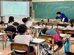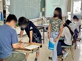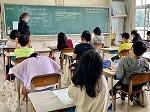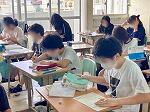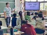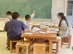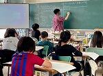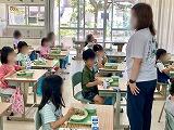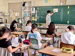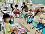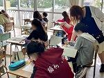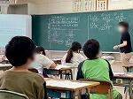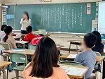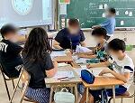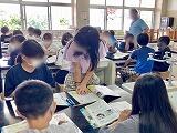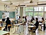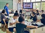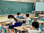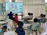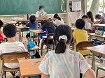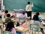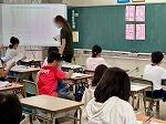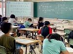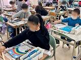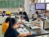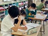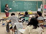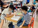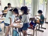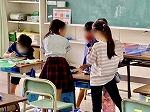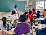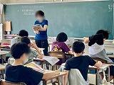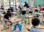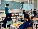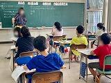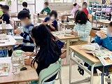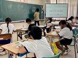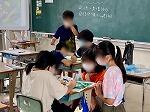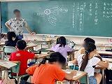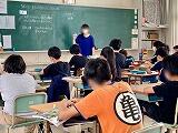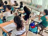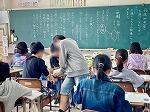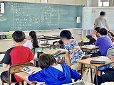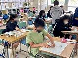 5年1組は社会の単元のまとめとして、使って欲しい言葉を提示し、日本は世界のどこにあるのかを説明するために、各種資料とにらめっこしながら席が隣の児童と協力しながらまとめていました。2組は図工で絵の具の彩色の勉強をしていて、指定された色を混ぜ合わせ、月桃の花が描かれた画用紙に彩色していました。