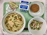 今日の給食は、カレーうどん、かぼちゃとさつまいものコロッケ、からし菜のタンカンサラダ、アーモンドカル、牛乳でした。