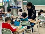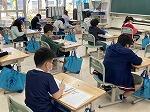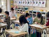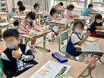 1年生はひらがなの学習で、どの部屋から始筆するのか、書き順は、とめ、はね、はらいなどを確認しながら、練習に励んでいました。
