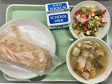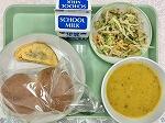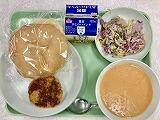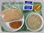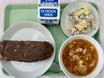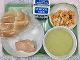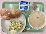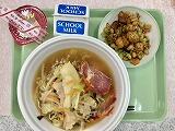 今日の給食の献立は、チーズポテトサラダ、ミネストローネ、ココアあげパン、牛乳でした。(6年生のみ二色あげパン「ココア&きなこ」でした)