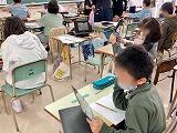 4年1組は大きさの等しい分数について、1を2等分や3等分、・・・された数直線を使って量感を意識しながら理解を深めていました。2組は国語で詩を集めて冊子にする活動に取り組んでいました。個人のタブレットに取りためた詩を見ながら、自分の詩集に載せる詩を選んでいました。