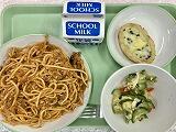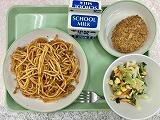 今日の給食の献立は、スパゲッティーなすミートソース、ポテトカップグラタン、イタリアンサラダ、焼きショコラ、牛乳でした。