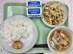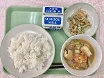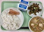 今日の給食の献立は、蓮根入りつくね、豆腐チャンプルー、シカムドゥチ、ごはん、牛乳でした。