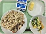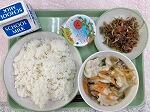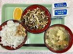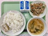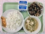 今日の給食の献立は、ひじき炒め、大根のみそ汁、魚のあけぼの焼き、ごはん、牛乳でした。