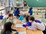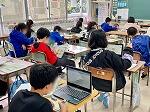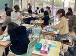 4年1組は国語「もしものときにそなえよう」で調べたことをもとにして書いた文章を友だちと読み合い、よりよい文章になるように考えていました。2組も1組同様にお互いに書いた文章を読み合い、付箋紙に感想を書いて伝え合う活動に取り組んでいました。