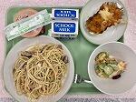 今日の給食の献立は、アサリの和風スパゲッティー、かぼちゃのチーズ焼き、豆サラダ、チョコプリン、牛乳でした。