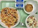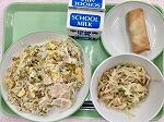 今日の給食の献立は、ほうれんそうとトマトのパスタ、ミンチカツ、ビーンズサラダ、牛乳でした。