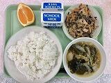 今日の給食は、魚のなんぶ焼き、からし菜の和え物、クファジューシー、牛乳、パインでした。