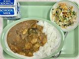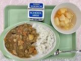 今日の給食の献立は、ポークカレー、ごはん、たくわん和え、牛乳でした。