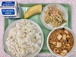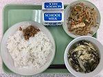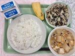 今日の給食の献立は、大根のそぼろ煮、ひじきのごまサラダ、ごはん、牛乳、バナナでした。