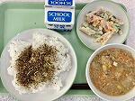 今日の給食の献立は、冬瓜のそぼろ煮、マカロニサラダ、手作りふりかけ、ごはん、牛乳でした。