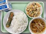 今日の給食の献立は、野菜炒め、竹輪の磯辺揚げ、魚のそうめん汁、ごはん、牛乳でした。