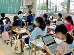 4年1組は理科「動物のからだのつくりと運動」について学習していて、体のほとんどが骨や肉でできていることを確認した後、動画で走っている人を見て、どこがどのように動いているのかを観察していました。2組は3けた÷1けたのわり算の学習に取り組んでいて、位を意識して商をたてて計算練習に取り組んでいました。