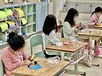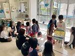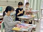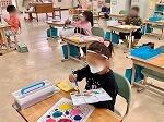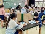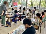 1年生は図工でタックカラー紙版画にチャレンジしていました。切り取ったタックカラー紙を組み合わせて絵を描き、水に浸した紙に写し取っていました。