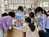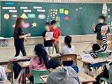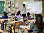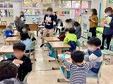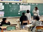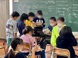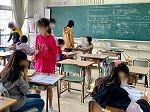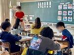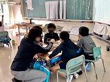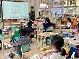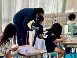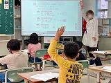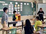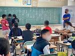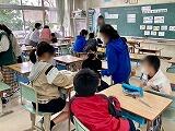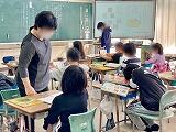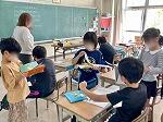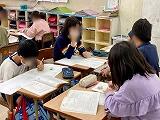 5年1組は算数「割合」の学習に取り組んでいて、先に〇をもらった児童がリトルティーチャーとなり、教え合いながら学習内容の理解を図っていました。2組はon、in、by、underなどの前置詞を使ってものがある場所を伝える活動をしていました。