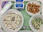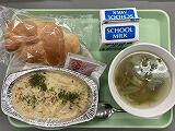 今日の給食の献立は、クリーミーリゾット、スパイシー揚げ、からし菜サラダ、ぶどうゼリー、牛乳でした。