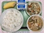 今日の給食は、こうや豆腐の卵とじ、味噌けんちん汁、バナナ、ごはん、牛乳でした。