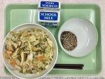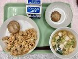 今日の給食の献立は、厚揚げの中華煮、バンサンスー、麦ごはん、牛乳でした。