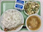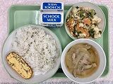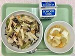 今日(昨日)の給食の献立は、坦々みそ汁、ししゃものマヨネーズ焼き、からしなチャンプルー、麦ごはん、牛乳でした。