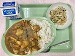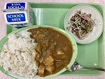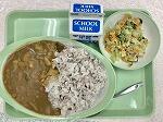 今日の給食は、チキンカレー、切り干し大根のサラダ、麦ごはん、牛乳でした。