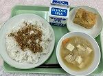 今日の給食は、揚げ出し豆腐、ふりかけ、石狩汁、麦ごはん、牛乳でした。
