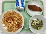 今日の給食の献立は、あじフライ、こんにゃくサラダ、きのこのトマトクリームスパゲッティー、牛乳でした。