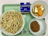 今日の給食は、肉野菜そば、紅芋ごま団子、牛乳でした。