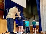 スポーツ部門で頑張っている子ども達の表彰朝会が体育館で行われ、今年に入ってから好成績を収めた大会でもらった賞状やメダルが授与されました。その他にも、各部活や地域のスポーツクラブで頑張っている児童の紹介もありました。