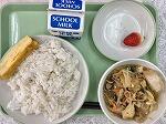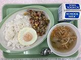 今日の給食の献立は、がパオライス、目玉焼き、タイ風フォーのスープ、ごはん、牛乳でした。